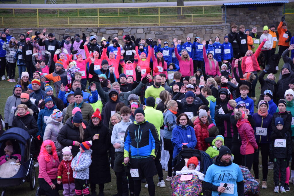V sobotu ráno nás nejdříve přivítalo lehce mrazivé počasí, protože bylo pás stupňů pod nulou. Jako bonus k tomu ale byla modrá obloha a svítilo sluníčko. Modrá obloha sice nevydržela celý den, ale co bychom chtěli v lednu. Všechny přípravné práce už máme docela natrénované, takže vedle hřiště rychle rostly stanové přístřešky, které se plnily várnicemi s gulášem, se spoustou koláčků, buchet, s teplými nápoji a letos dokonce i s parádními čerstvě připravovanými palačinkami. Ale nejdůležitější byl stan určený pro registrace. Tam se děly neskutečné věci. Zástup dětských a dospělých běžců totiž nějak nebral konce. Dokonce nám pro pár dospělých běžců došla startovní čísla!!! A to jsme jich měli 300 kusů! Na hlavní závod se nám přihlásilo nečekaných 304 běžců. A v dětských závodech bylo 77 dětí. To jsou skutečně úctyhodná čísla a měli jsme z nich fakt velikou radost. Kromě toho bylo i spousta neběžců, kteří si šli trasu hlavního závodu projít procházkou.